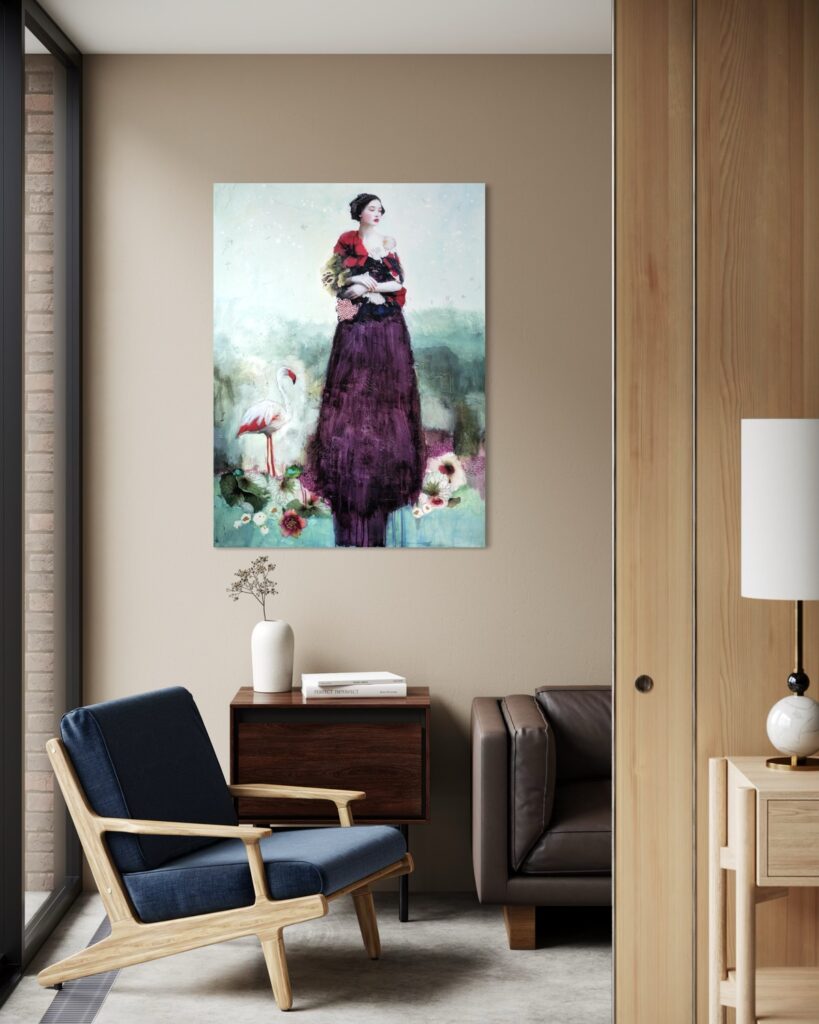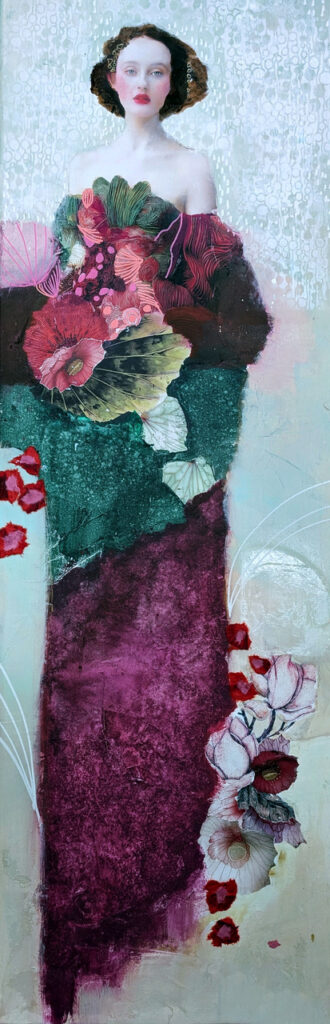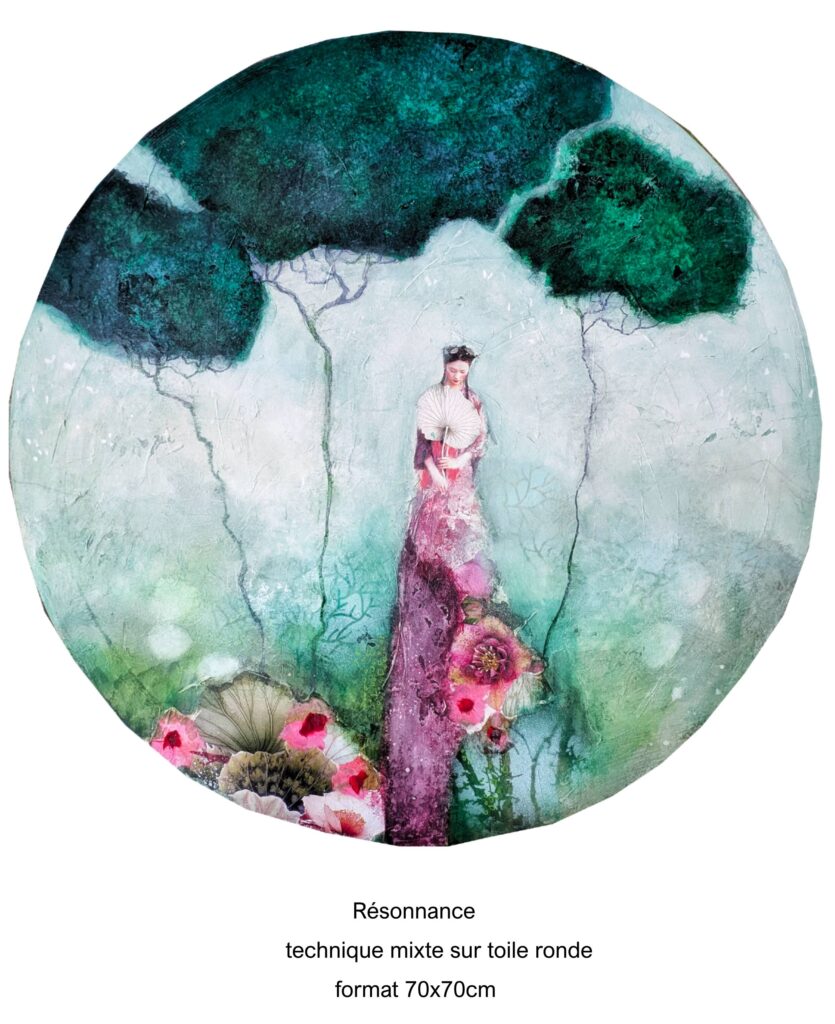 Each woman I depict becomes a visual poem: she embodies both the invisible strength of roots and the aspiration toward spiritual elevation. Between matter and transparency, my works invite intimate contemplation, an inner breath where poetry, softness, and meditation intertwine."