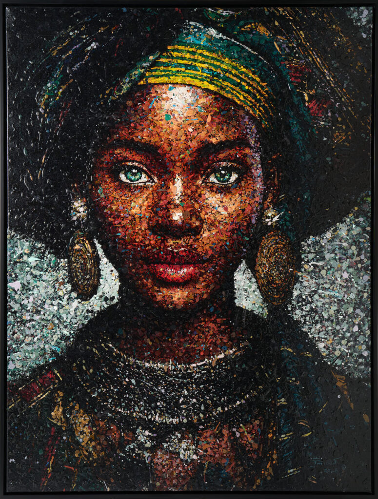 De techniek die hij gebruikt is bijzonder; hij schildert heel veel kleine streepjes of stipjes die samen 1 portret vormen.